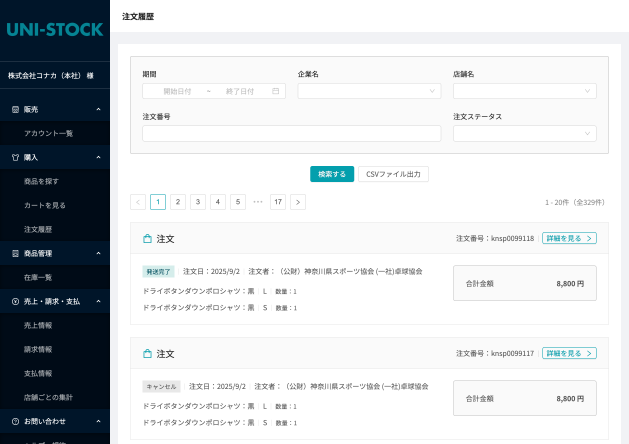 FC店の購入履歴も閲覧、CSVダウンロード可能なので、そちらを基にFC店へご請求いただけます。 -